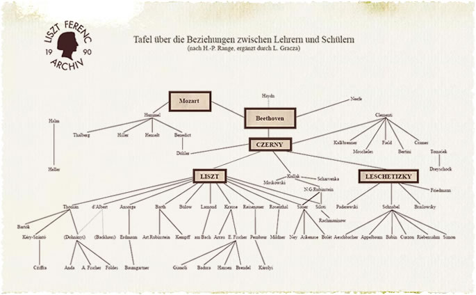 Tafel über die Beziehungen zwischen Lehrern und Schülern im Umkreis von Franz Liszt.